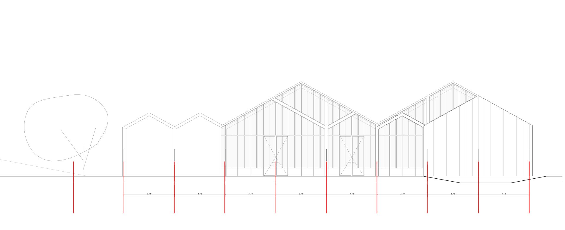 una struttura con una facciata che ospitava una forma ad albero decentrata, dalla quale si generavano lateralmente due volumi simili a piccole serre.