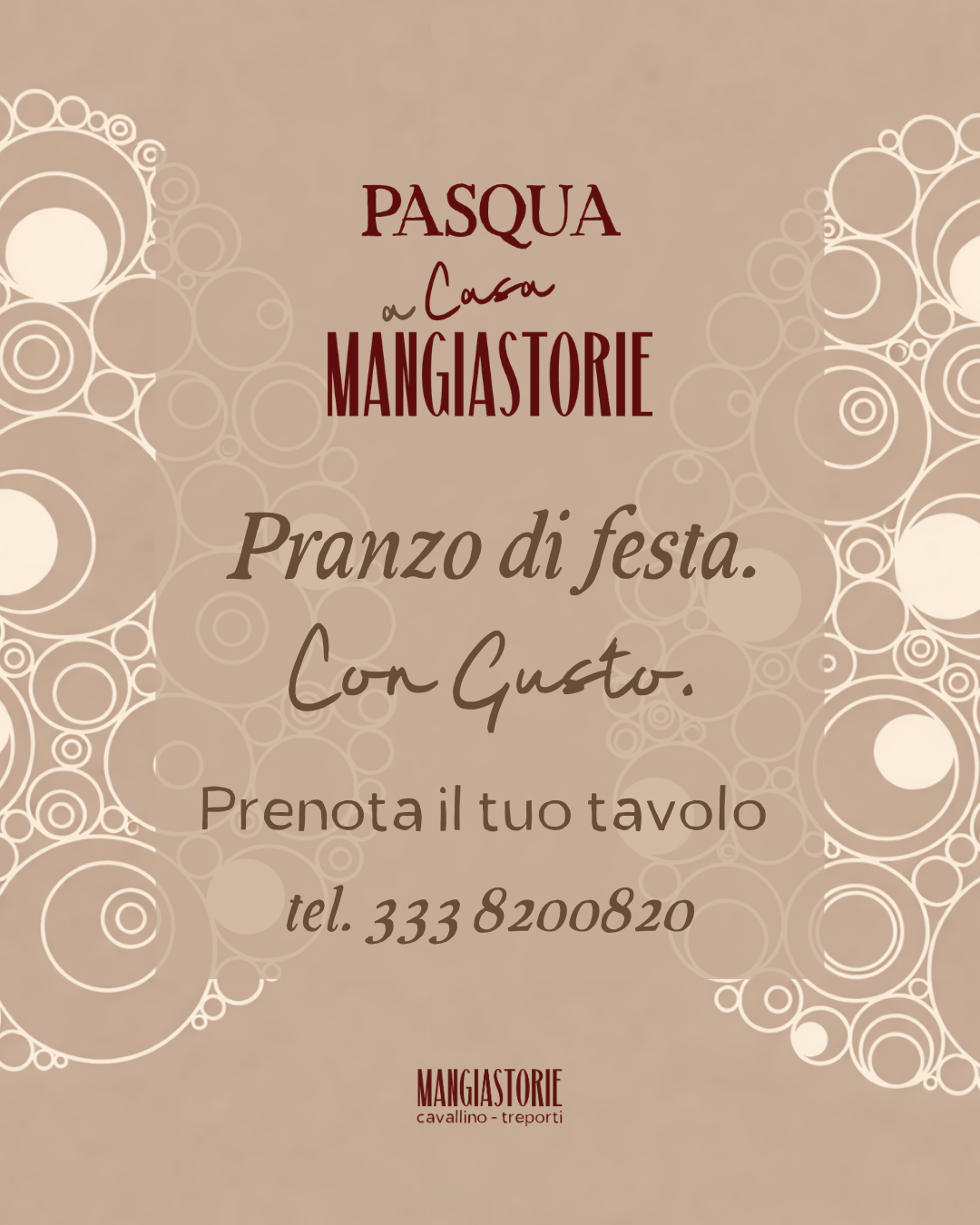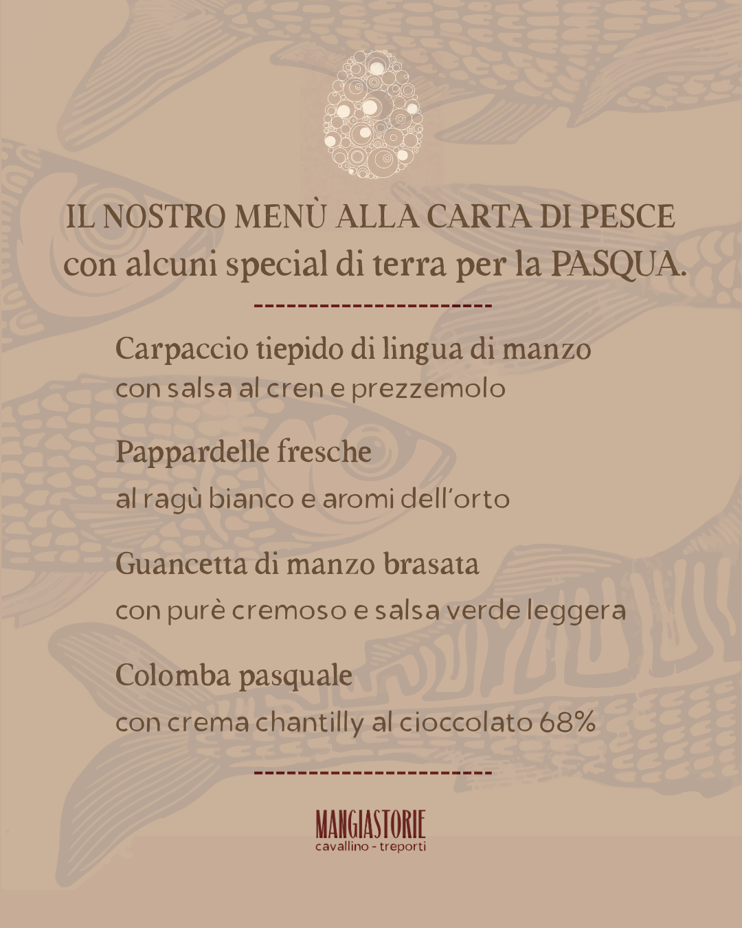 Domenica 5 aprile, Mangiastorie è lieto di accogliervi per il pranzo di Pasqua, un momento pensato per ritrovarsi e stare insieme.
